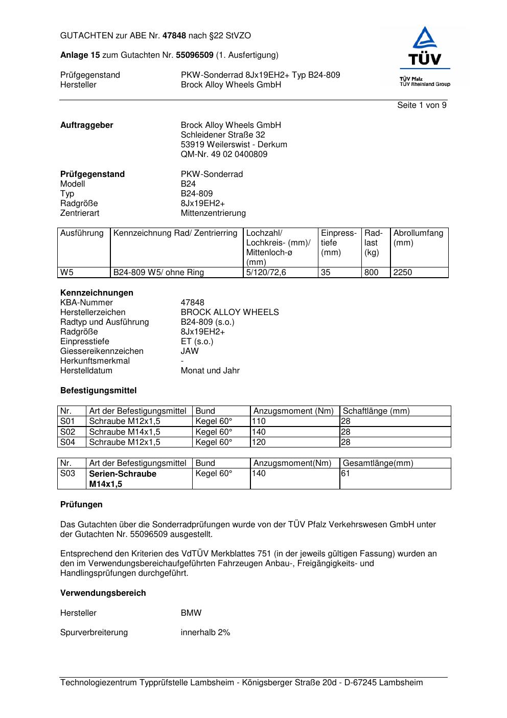 Dieses Gutachten (abe) bezieht sich auf die Alufelge Brock B24-809 in der Ausführung ET 0, Mittenloch 0 mm (KBA 47848). Im PDF findest du typischerweise zulässige Reifengrößen, Auflagen/Anbauhinweise und – je nach Dokument – Hinweise zur Eintragung.