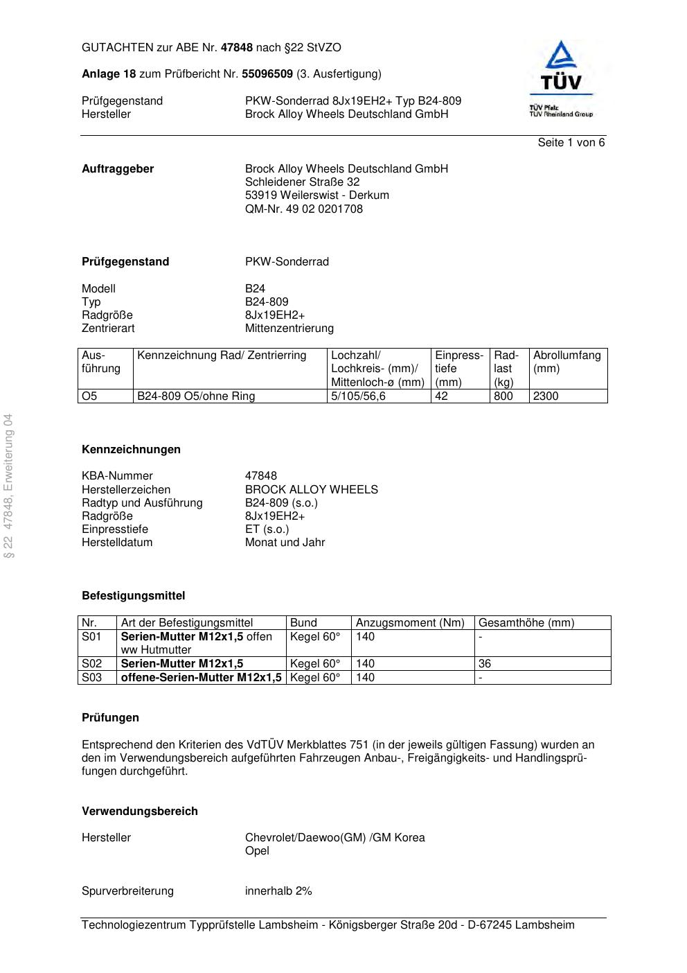 Dieses Gutachten (abe) bezieht sich auf die Alufelge Brock B24-809 in der Ausführung ET 0, Mittenloch 0 mm (KBA 47848). Im PDF findest du typischerweise zulässige Reifengrößen, Auflagen/Anbauhinweise und – je nach Dokument – Hinweise zur Eintragung.
