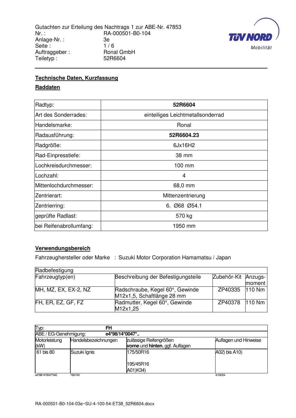 Dieses Gutachten (abe) bezieht sich auf die Alufelge ATS 52R6604 in der Ausführung 6Jx16 ET 0, Mittenloch 0 mm (KBA 47853). Im PDF findest du typischerweise zulässige Reifengrößen, Auflagen/Anbauhinweise und – je nach Dokument – Hinweise zur Eintragung.