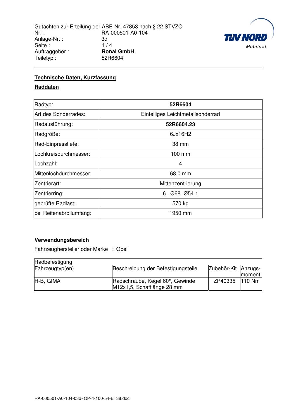 Dieses Gutachten (abe) bezieht sich auf die Alufelge Ronal 52R6604 in der Ausführung 6Jx16 ET 0, Mittenloch 0 mm (KBA 47853). Im PDF findest du typischerweise zulässige Reifengrößen, Auflagen/Anbauhinweise und – je nach Dokument – Hinweise zur Eintragung.