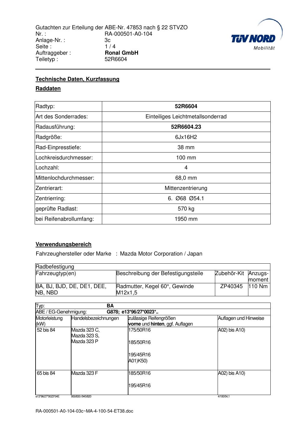 Dieses Gutachten (abe) bezieht sich auf die Alufelge Ronal 52R6604 in der Ausführung 6Jx16 ET 0, Mittenloch 0 mm (KBA 47853). Im PDF findest du typischerweise zulässige Reifengrößen, Auflagen/Anbauhinweise und – je nach Dokument – Hinweise zur Eintragung.