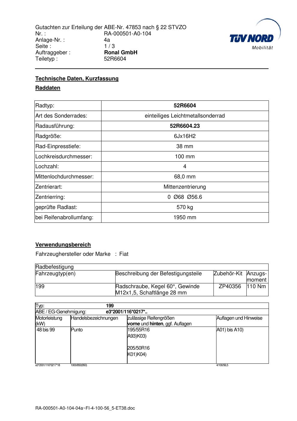 Dieses Gutachten (abe) bezieht sich auf die Alufelge Ronal 52R6604 in der Ausführung 6Jx16 ET 0, Mittenloch 0 mm (KBA 47853). Im PDF findest du typischerweise zulässige Reifengrößen, Auflagen/Anbauhinweise und – je nach Dokument – Hinweise zur Eintragung.