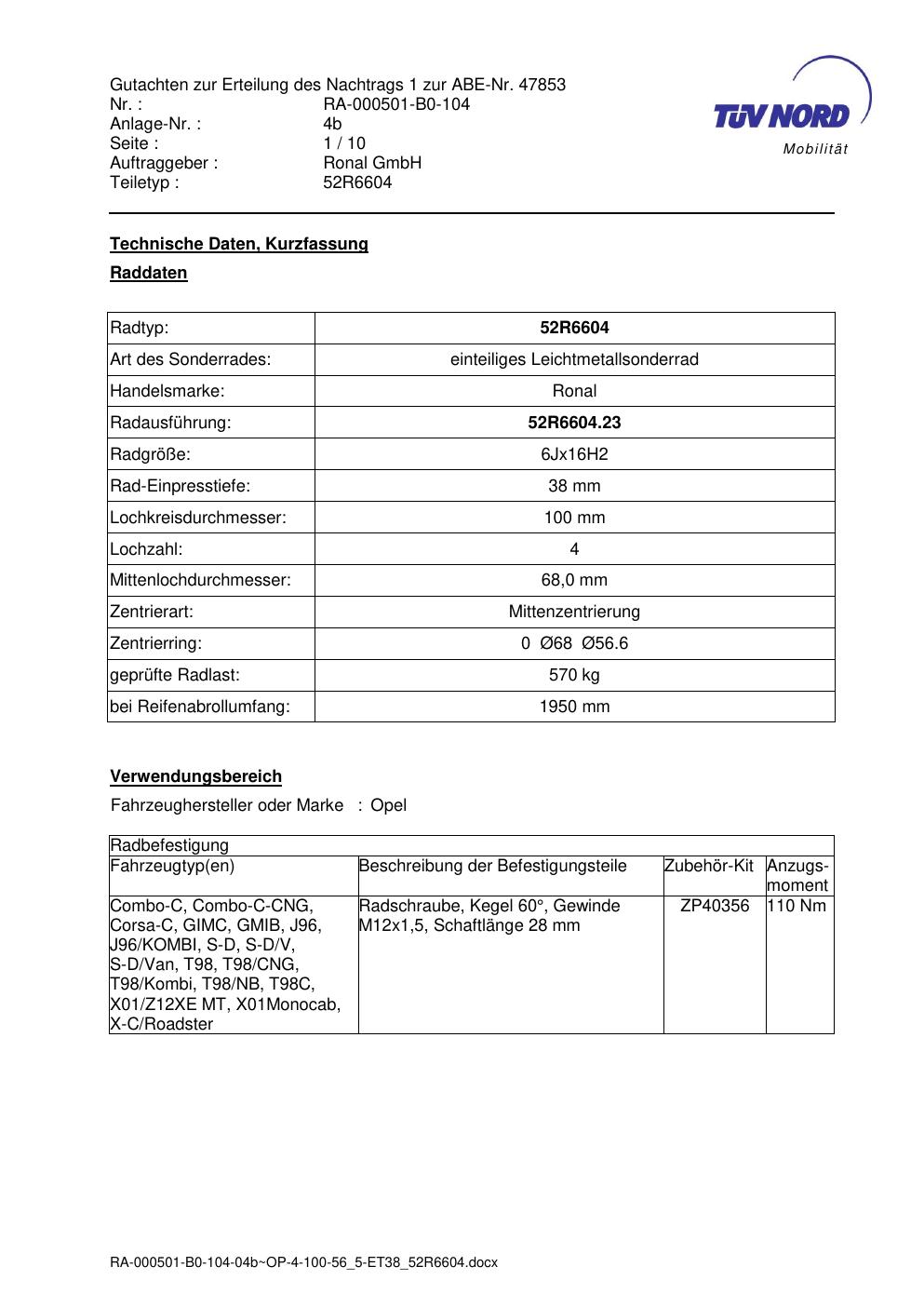 Dieses Gutachten (abe) bezieht sich auf die Alufelge Ronal 52R6604 in der Ausführung 6Jx16 ET 0, Mittenloch 0 mm (KBA 47853). Im PDF findest du typischerweise zulässige Reifengrößen, Auflagen/Anbauhinweise und – je nach Dokument – Hinweise zur Eintragung.