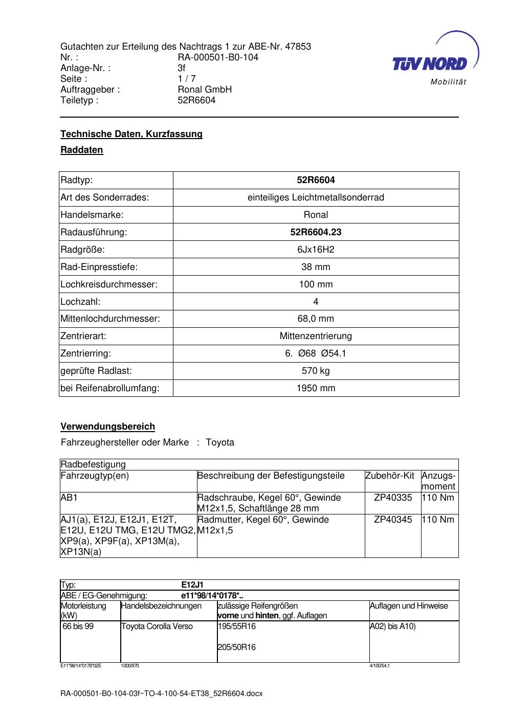 Dieses Gutachten (abe) bezieht sich auf die Alufelge Ronal 52R6604 in der Ausführung 6Jx16 ET 0, Mittenloch 0 mm (KBA 47853). Im PDF findest du typischerweise zulässige Reifengrößen, Auflagen/Anbauhinweise und – je nach Dokument – Hinweise zur Eintragung.