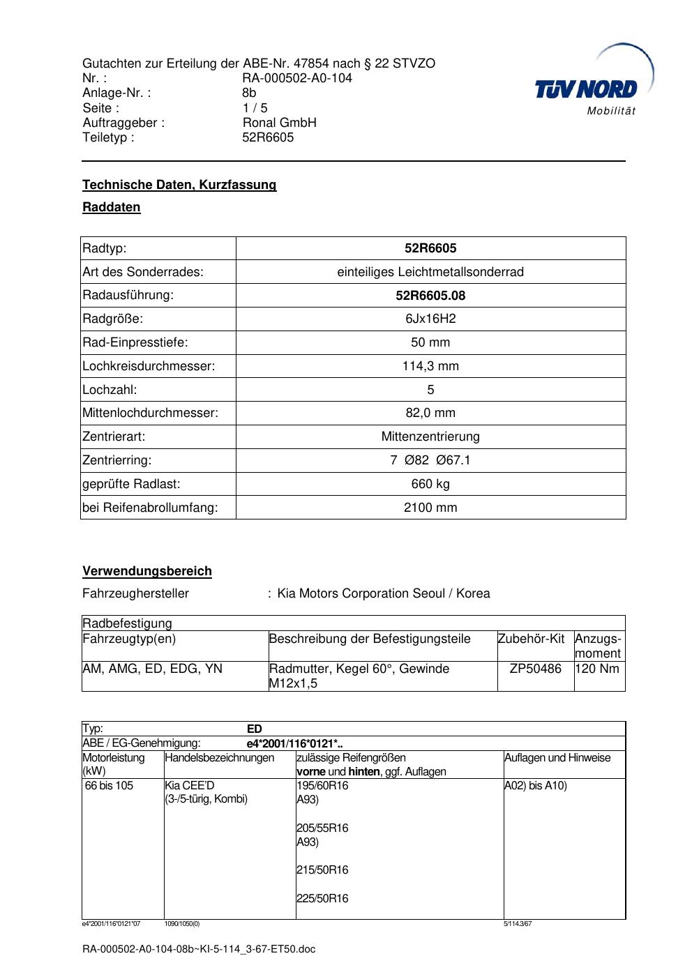 Dieses Gutachten (abe) bezieht sich auf die Alufelge Ronal 52R6605 in der Ausführung 6Jx16 ET 0, Mittenloch 0 mm (KBA 47854). Im PDF findest du typischerweise zulässige Reifengrößen, Auflagen/Anbauhinweise und – je nach Dokument – Hinweise zur Eintragung.
