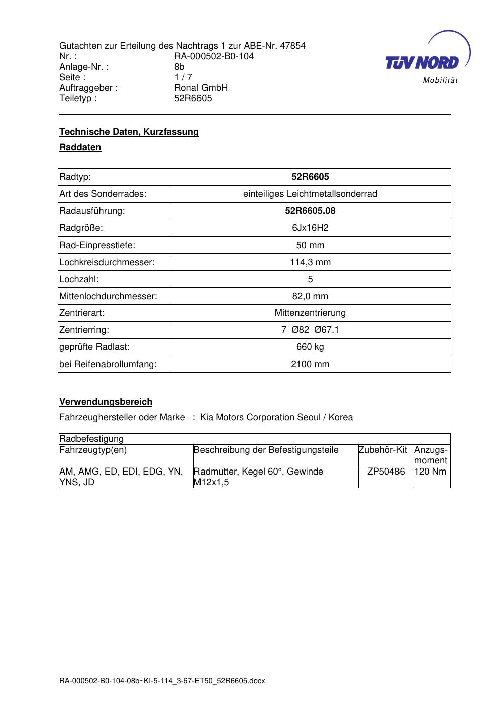 Dieses Gutachten (abe) bezieht sich auf die Alufelge Ronal 52R6605 in der Ausführung 6Jx16 ET 0, Mittenloch 0 mm (KBA 47854). Im PDF findest du typischerweise zulässige Reifengrößen, Auflagen/Anbauhinweise und – je nach Dokument – Hinweise zur Eintragung.