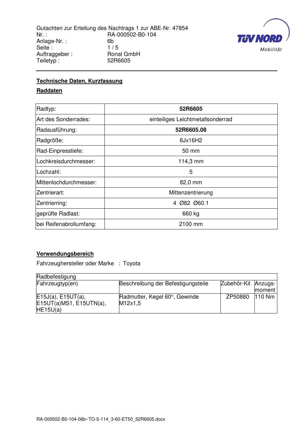 Dieses Gutachten (abe) bezieht sich auf die Alufelge Ronal 52R6605 in der Ausführung 6Jx16 ET 0, Mittenloch 0 mm (KBA 47854). Im PDF findest du typischerweise zulässige Reifengrößen, Auflagen/Anbauhinweise und – je nach Dokument – Hinweise zur Eintragung.