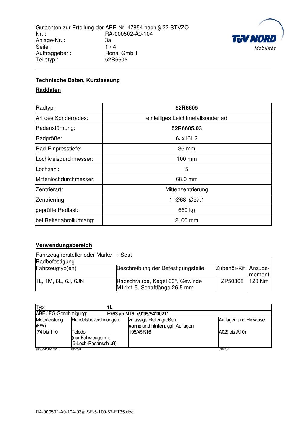Dieses Gutachten (abe) bezieht sich auf die Alufelge Ronal 52R6605 in der Ausführung 6Jx16 ET 0, Mittenloch 0 mm (KBA 47854). Im PDF findest du typischerweise zulässige Reifengrößen, Auflagen/Anbauhinweise und – je nach Dokument – Hinweise zur Eintragung.