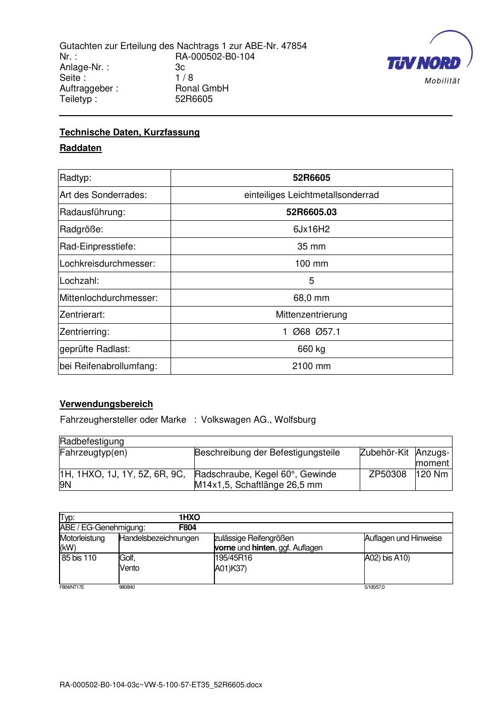 Dieses Gutachten (abe) bezieht sich auf die Alufelge Ronal 52R6605 in der Ausführung 6Jx16 ET 0, Mittenloch 0 mm (KBA 47854). Im PDF findest du typischerweise zulässige Reifengrößen, Auflagen/Anbauhinweise und – je nach Dokument – Hinweise zur Eintragung.