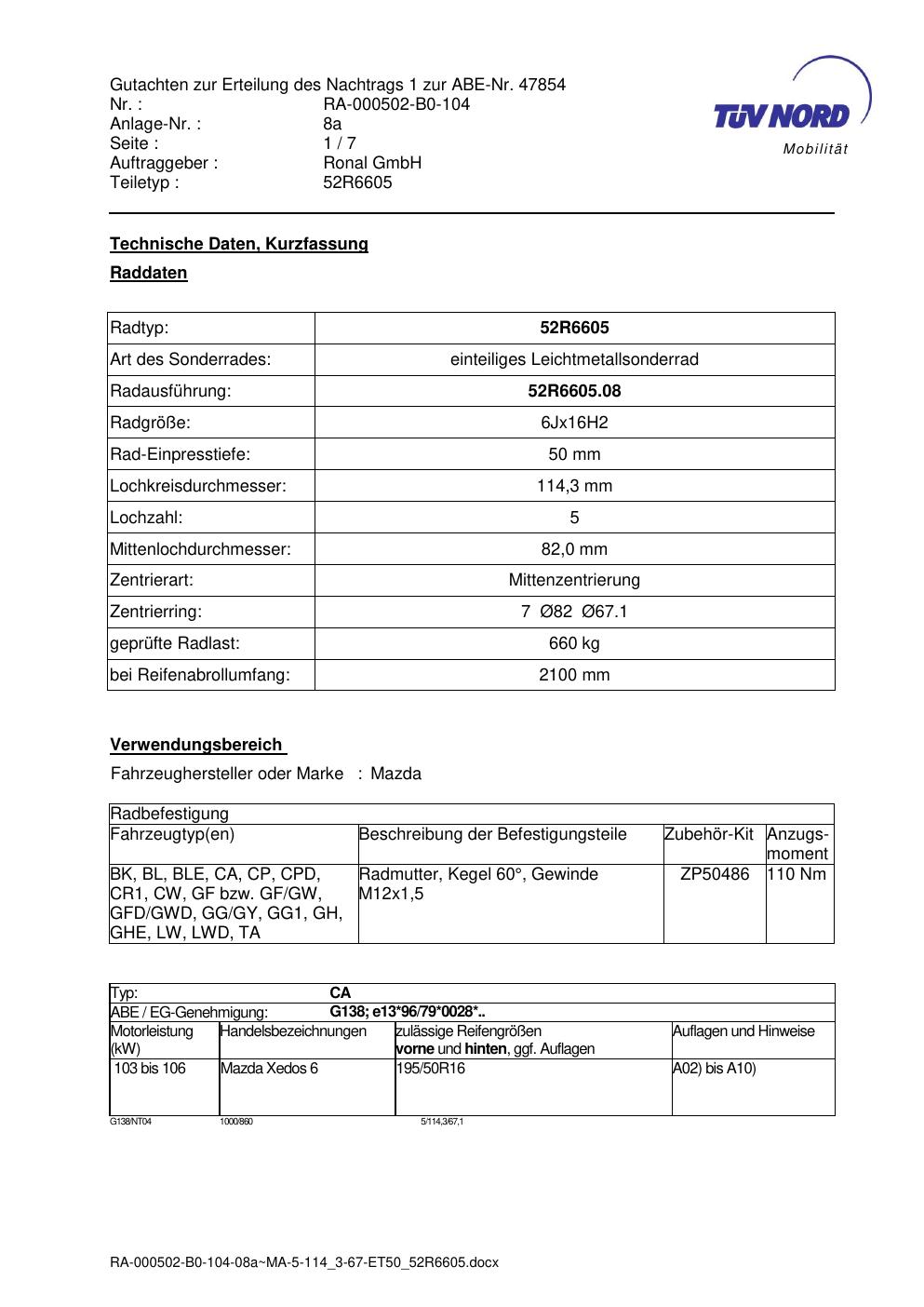 Dieses Gutachten (abe) bezieht sich auf die Alufelge Ronal 52R6605 in der Ausführung 6Jx16 ET 0, Mittenloch 0 mm (KBA 47854). Im PDF findest du typischerweise zulässige Reifengrößen, Auflagen/Anbauhinweise und – je nach Dokument – Hinweise zur Eintragung.