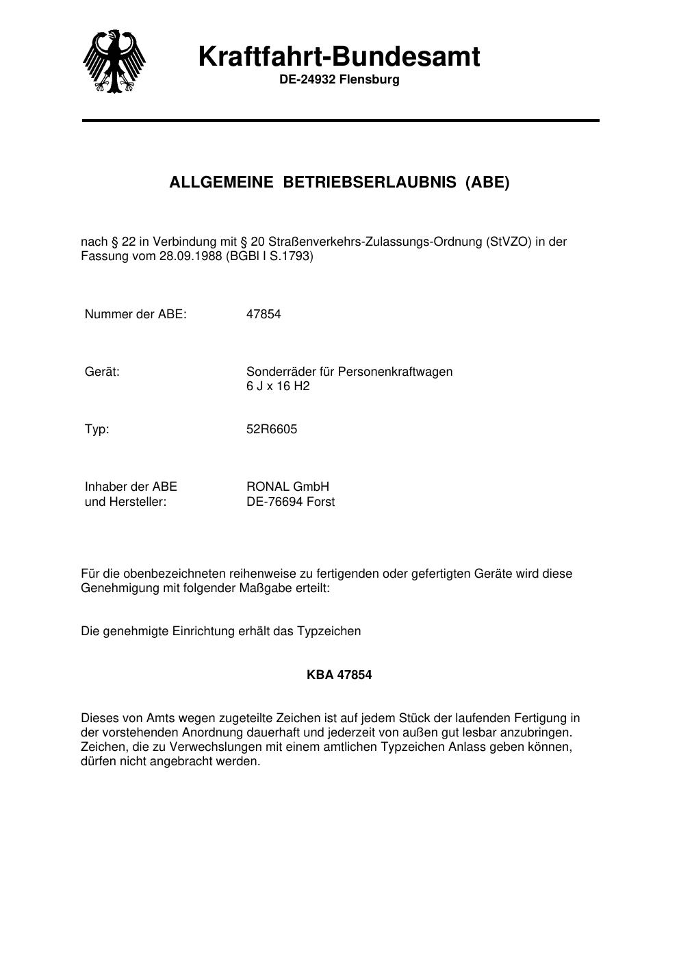 Dieses Gutachten (abe) bezieht sich auf die Alufelge Ronal 52R6605 in der Ausführung 6Jx16 ET 0, Mittenloch 0 mm (KBA 47854). Im PDF findest du typischerweise zulässige Reifengrößen, Auflagen/Anbauhinweise und – je nach Dokument – Hinweise zur Eintragung.