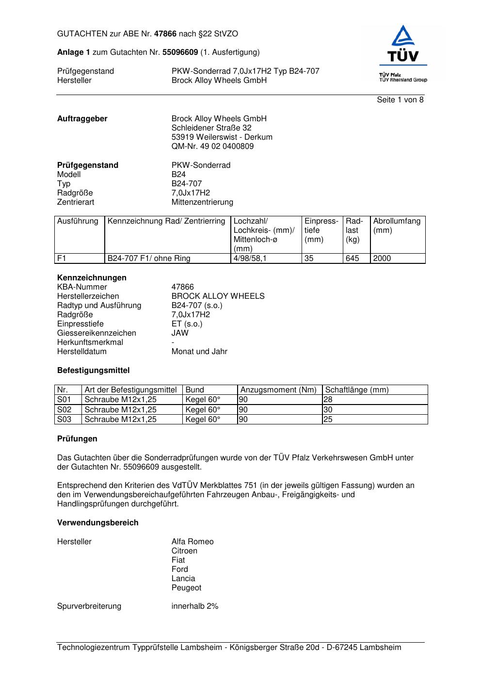 Felgengutachten / abe für Alufelgen Brock B24-707 (7Jx17 ET 0, Mittenloch 0 mm) mit KBA 47866 (Zertifikatsnummer 47866). Hier kostenlos als PDF herunterladen. Der Download-Link ist 24 Stunden gültig und kann bis zu zwei Mal verwendet werden.