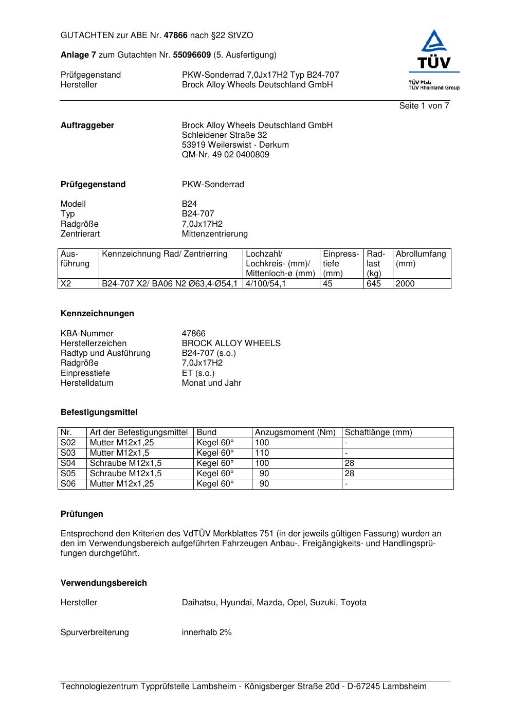 Dieses Gutachten (abe) bezieht sich auf die Alufelge Brock B24-707 in der Ausführung 7Jx17 ET 0, Mittenloch 0 mm (KBA 47866). Im PDF findest du typischerweise zulässige Reifengrößen, Auflagen/Anbauhinweise und – je nach Dokument – Hinweise zur Eintragung.