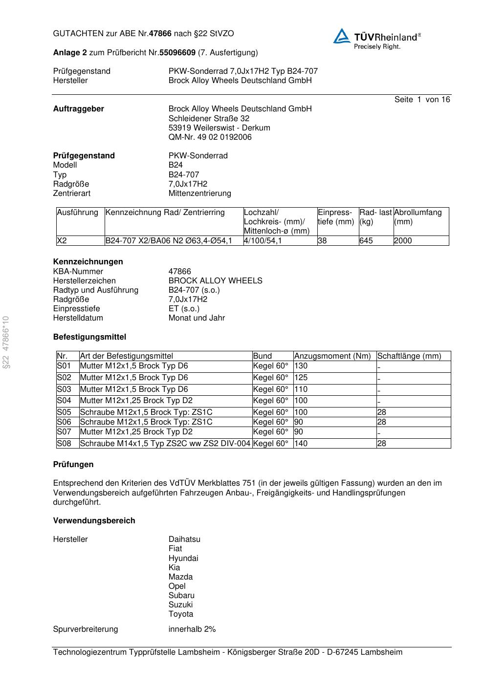Felgengutachten / abe für Alufelgen Brock B24-707 (7Jx17 ET 0, Mittenloch 0 mm) mit KBA 47866 (Zertifikatsnummer 47866). Hier kostenlos als PDF herunterladen. Der Download-Link ist 24 Stunden gültig und kann bis zu zwei Mal verwendet werden.