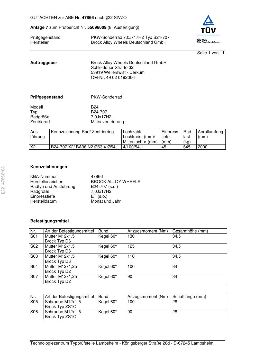Dieses Gutachten (abe) bezieht sich auf die Alufelge Brock B24-707 in der Ausführung 7Jx17 ET 0, Mittenloch 0 mm (KBA 47866). Im PDF findest du typischerweise zulässige Reifengrößen, Auflagen/Anbauhinweise und – je nach Dokument – Hinweise zur Eintragung.