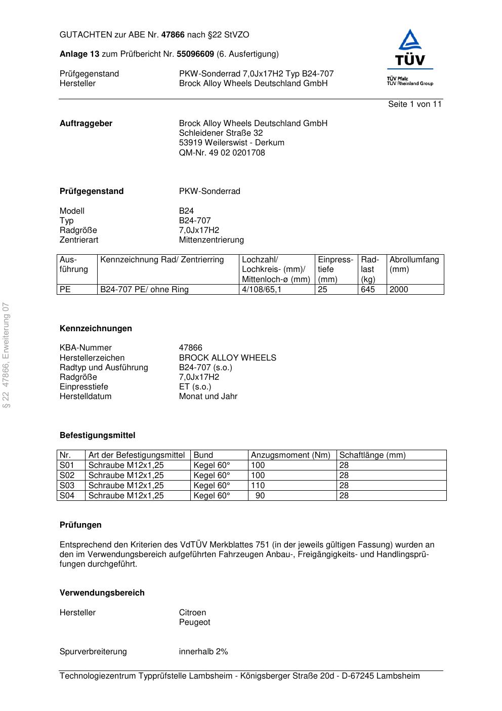 Dieses Gutachten (abe) bezieht sich auf die Alufelge Brock B24-707 in der Ausführung 7Jx17 ET 0, Mittenloch 0 mm (KBA 47866). Im PDF findest du typischerweise zulässige Reifengrößen, Auflagen/Anbauhinweise und – je nach Dokument – Hinweise zur Eintragung.