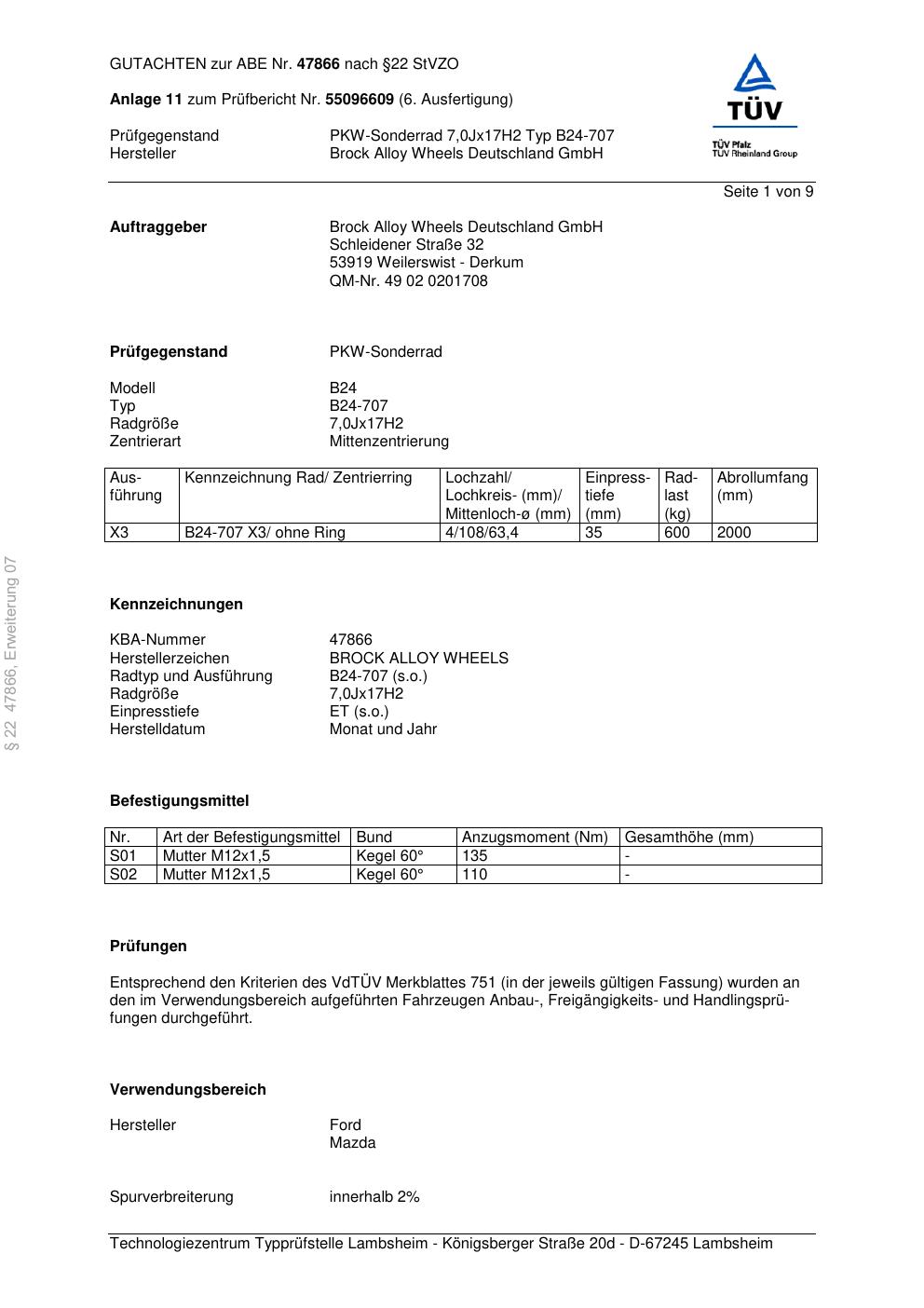 Dieses Gutachten (abe) bezieht sich auf die Alufelge Brock B24-707 in der Ausführung 7Jx17 ET 0, Mittenloch 0 mm (KBA 47866). Im PDF findest du typischerweise zulässige Reifengrößen, Auflagen/Anbauhinweise und – je nach Dokument – Hinweise zur Eintragung.
