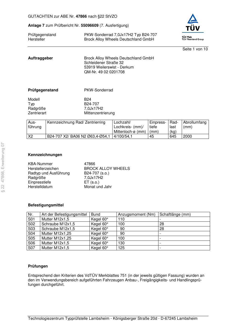 Dieses Gutachten (abe) bezieht sich auf die Alufelge Brock B24-707 in der Ausführung 7Jx17 ET 0, Mittenloch 0 mm (KBA 47866). Im PDF findest du typischerweise zulässige Reifengrößen, Auflagen/Anbauhinweise und – je nach Dokument – Hinweise zur Eintragung.