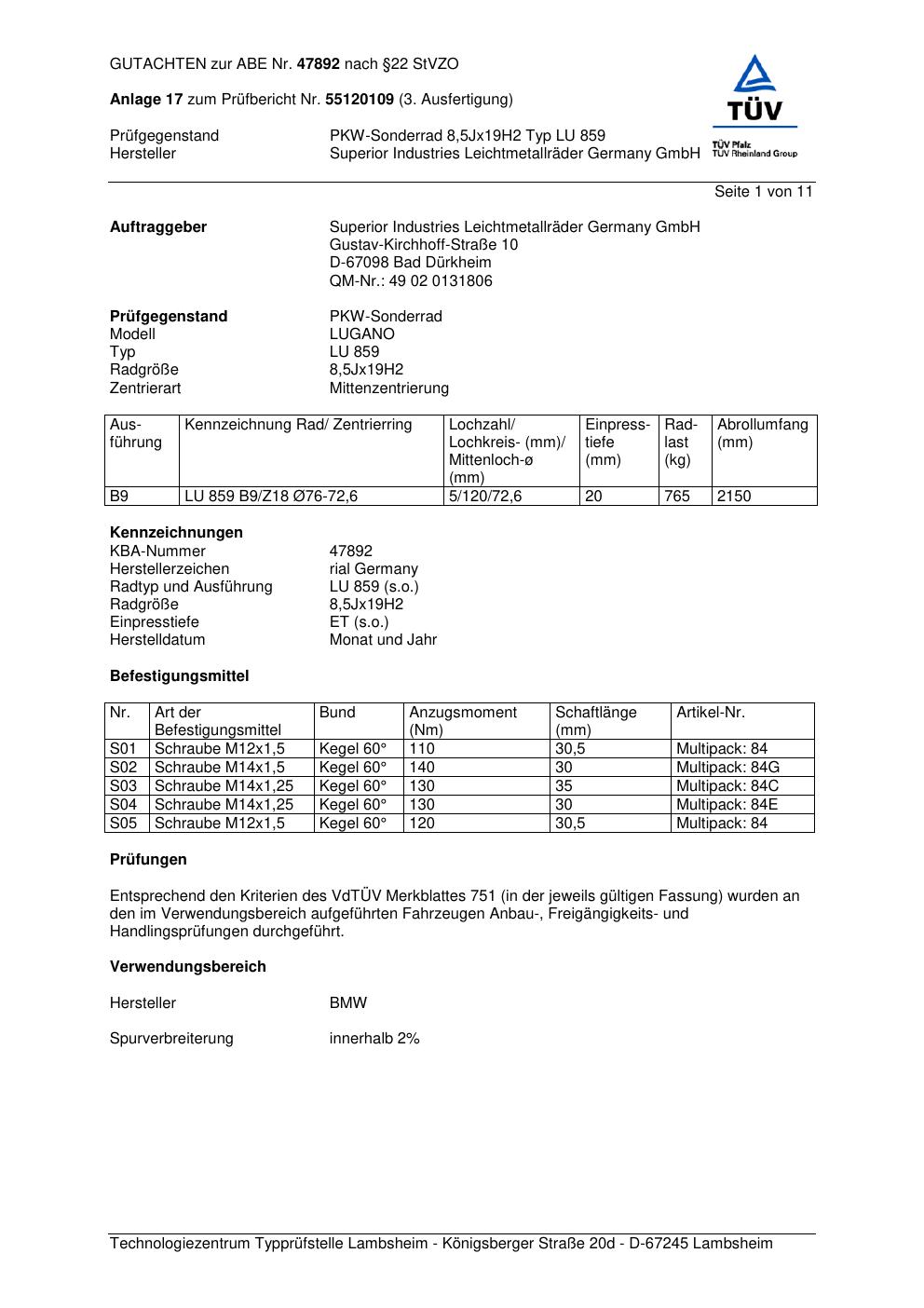 Dieses Gutachten (abe) bezieht sich auf die Alufelge brand-rial LU 859 in der Ausführung 8.5Jx19 ET 0, Mittenloch 0 mm (KBA 47892). Im PDF findest du typischerweise zulässige Reifengrößen, Auflagen/Anbauhinweise und – je nach Dokument – Hinweise zur Eintragung.
