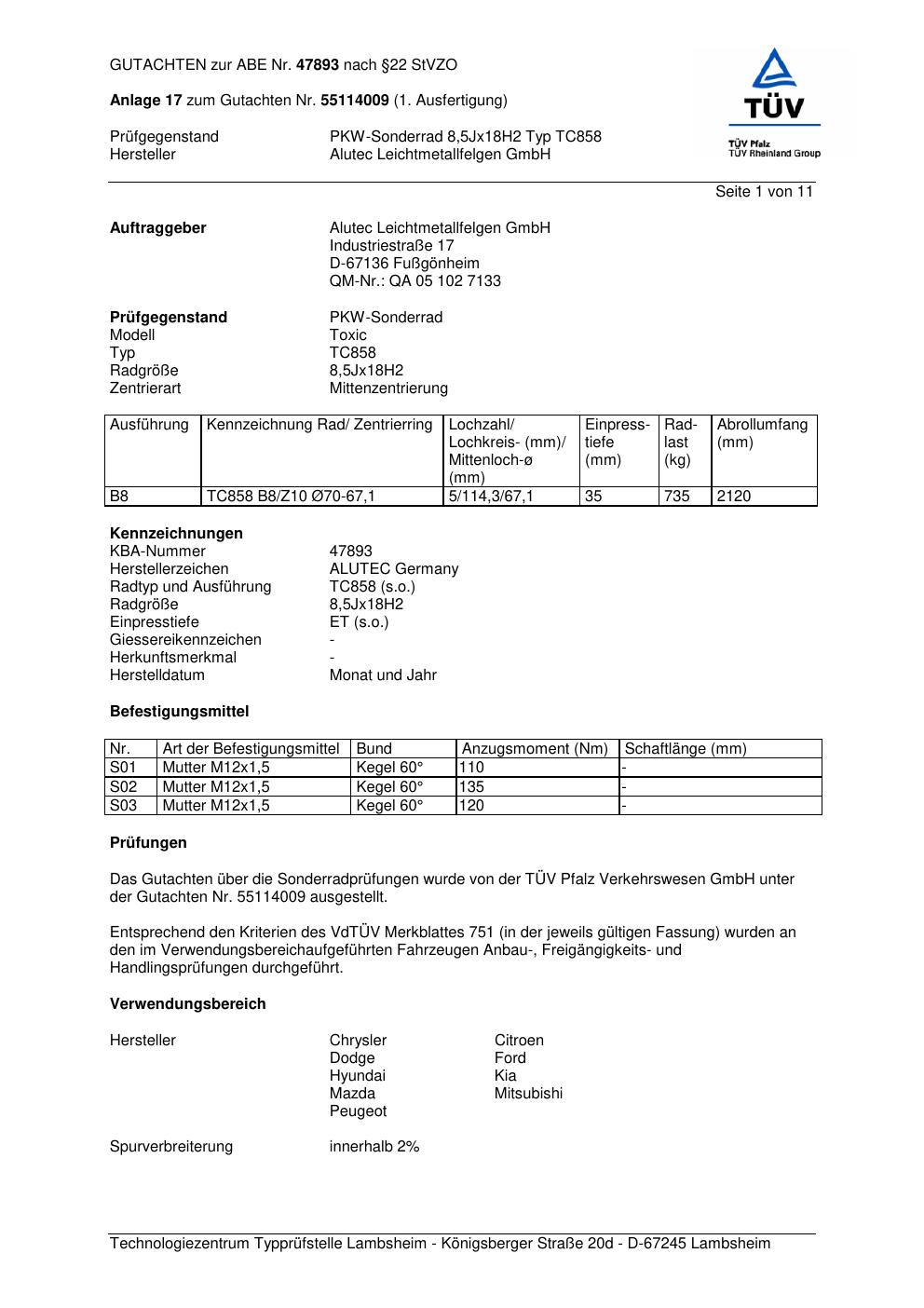 Dieses Gutachten (abe) bezieht sich auf die Alufelge ALUTEC TC858 in der Ausführung 8.5Jx18 ET 0, Mittenloch 0 mm (KBA 47893). Im PDF findest du typischerweise zulässige Reifengrößen, Auflagen/Anbauhinweise und – je nach Dokument – Hinweise zur Eintragung.