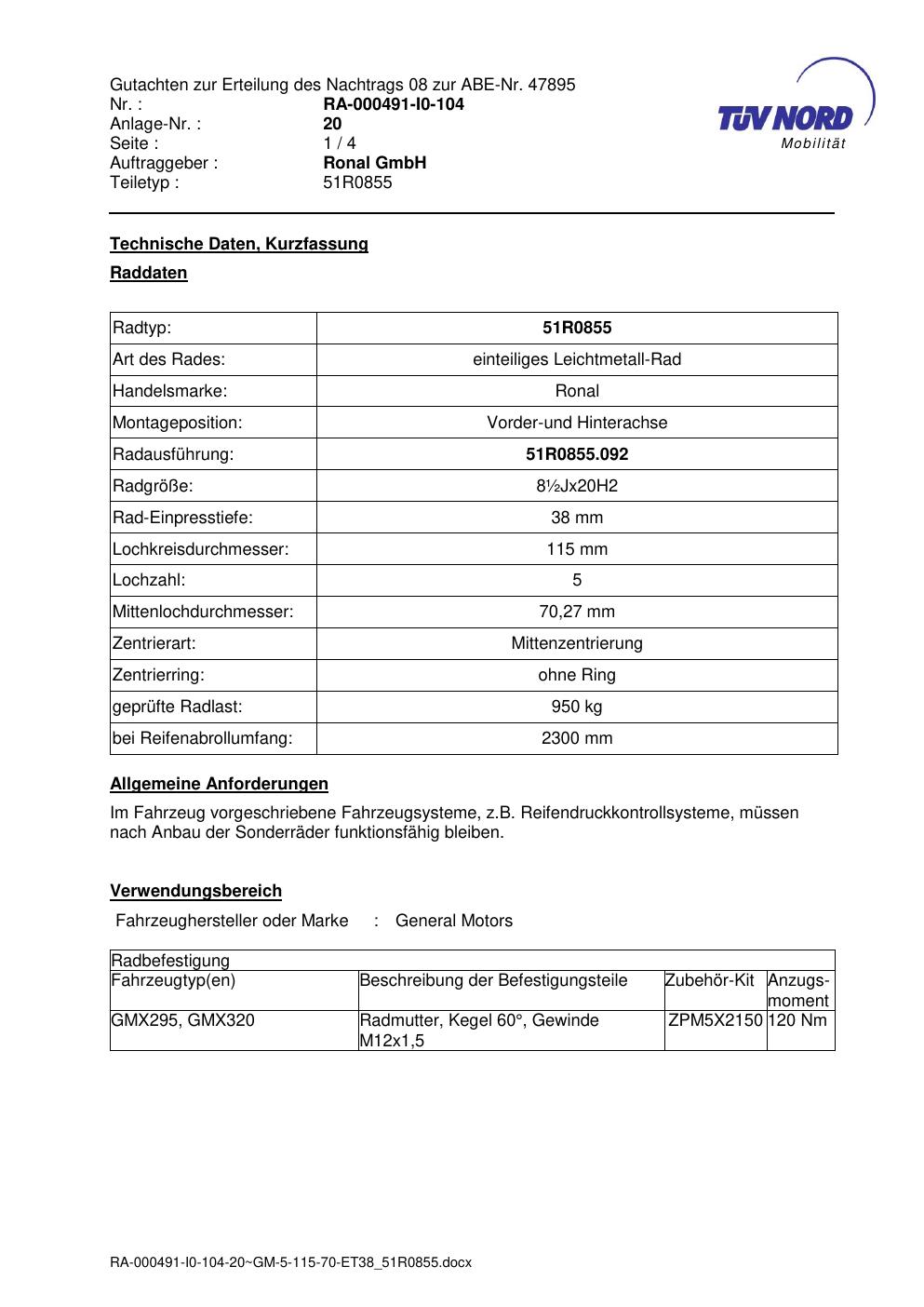 Dieses Gutachten (abe) bezieht sich auf die Alufelge Ronal 51R0855 in der Ausführung ET 0, Mittenloch 0 mm (KBA 47895). Im PDF findest du typischerweise zulässige Reifengrößen, Auflagen/Anbauhinweise und – je nach Dokument – Hinweise zur Eintragung.