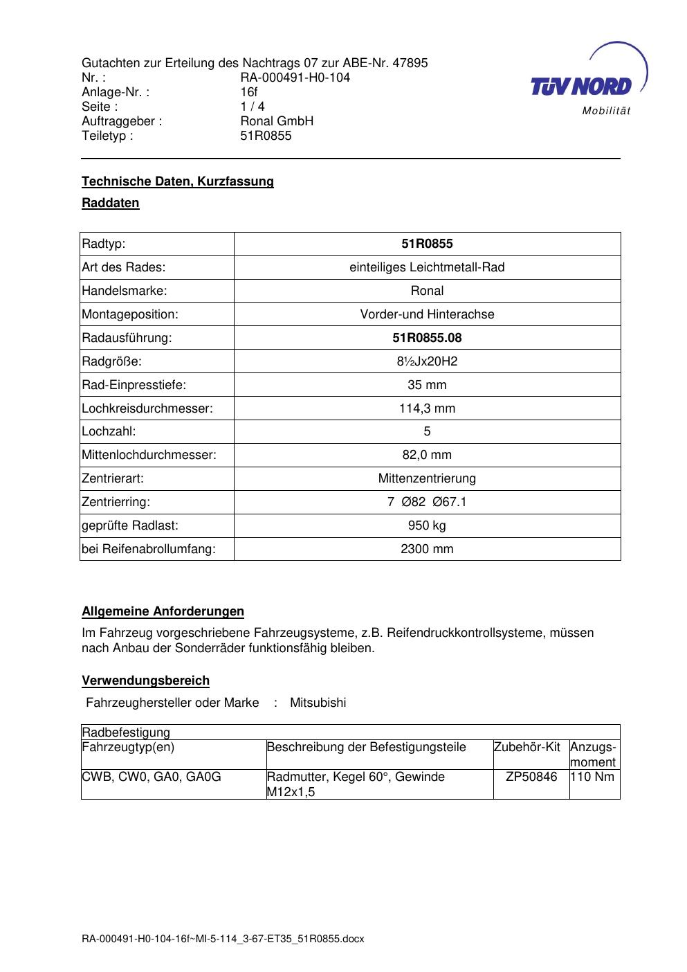 Dieses Gutachten (abe) bezieht sich auf die Alufelge Ronal 51R0855 in der Ausführung ET 0, Mittenloch 0 mm (KBA 47895). Im PDF findest du typischerweise zulässige Reifengrößen, Auflagen/Anbauhinweise und – je nach Dokument – Hinweise zur Eintragung.