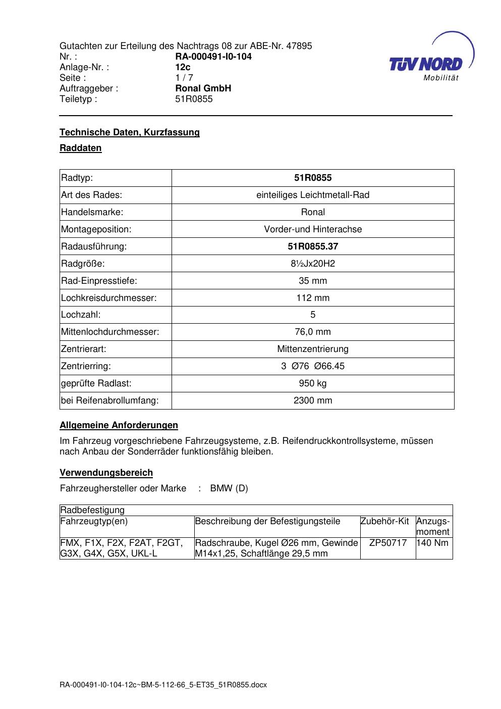 Dieses Gutachten (abe) bezieht sich auf die Alufelge Ronal 51R0855 in der Ausführung ET 0, Mittenloch 0 mm (KBA 47895). Im PDF findest du typischerweise zulässige Reifengrößen, Auflagen/Anbauhinweise und – je nach Dokument – Hinweise zur Eintragung.