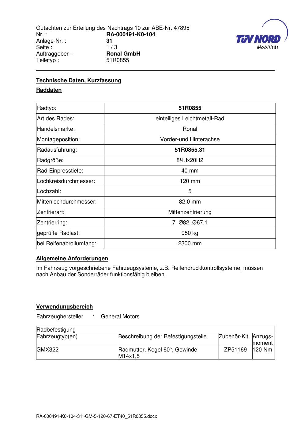 Dieses Gutachten (abe) bezieht sich auf die Alufelge Ronal 51R0855 in der Ausführung ET 0, Mittenloch 0 mm (KBA 47895). Im PDF findest du typischerweise zulässige Reifengrößen, Auflagen/Anbauhinweise und – je nach Dokument – Hinweise zur Eintragung.