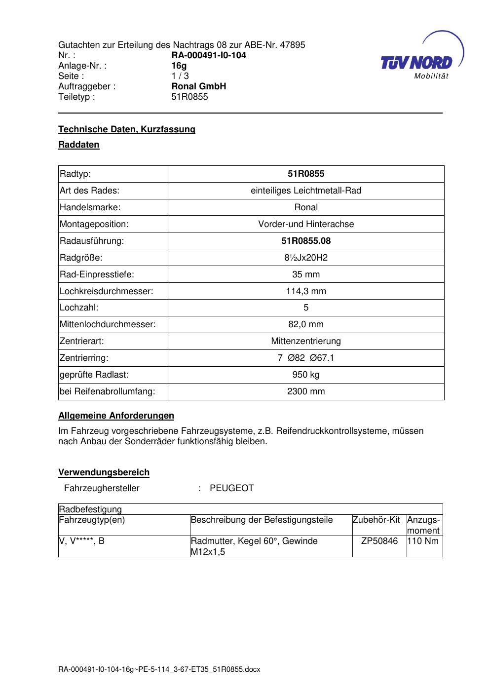 Dieses Gutachten (abe) bezieht sich auf die Alufelge Ronal 51R0855 in der Ausführung ET 0, Mittenloch 0 mm (KBA 47895). Im PDF findest du typischerweise zulässige Reifengrößen, Auflagen/Anbauhinweise und – je nach Dokument – Hinweise zur Eintragung.