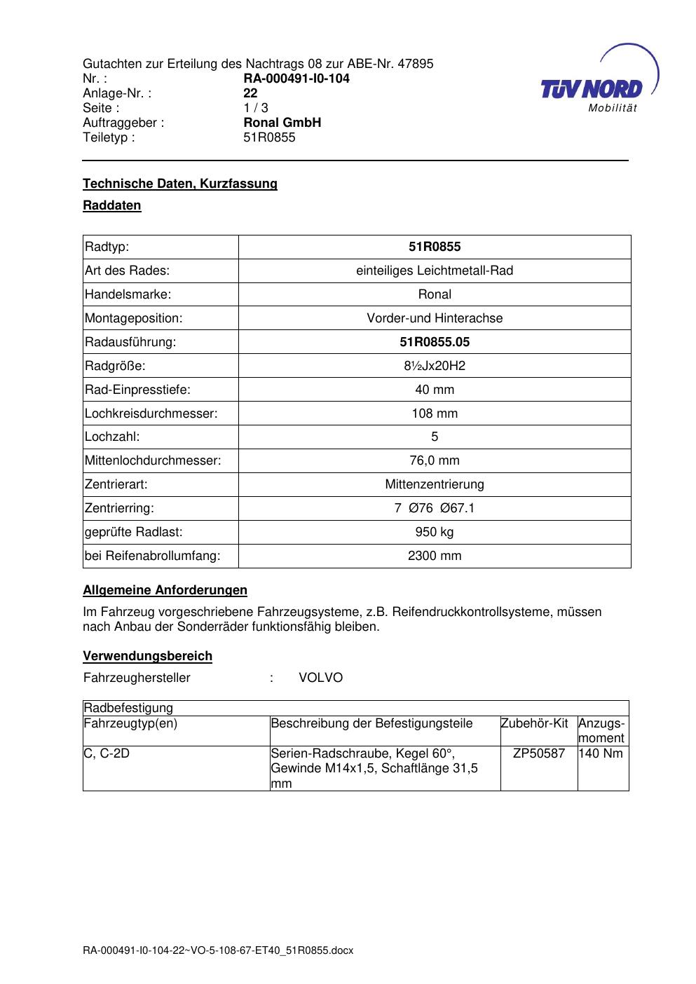 Dieses Gutachten (abe) bezieht sich auf die Alufelge Ronal 51R0855 in der Ausführung ET 0, Mittenloch 0 mm (KBA 47895). Im PDF findest du typischerweise zulässige Reifengrößen, Auflagen/Anbauhinweise und – je nach Dokument – Hinweise zur Eintragung.