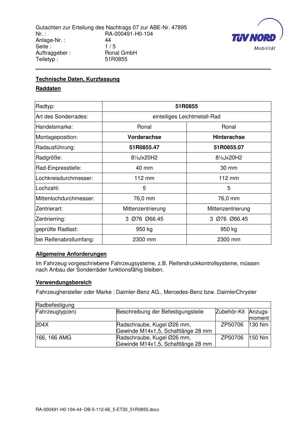 Dieses Gutachten (abe) bezieht sich auf die Alufelge Ronal 51R0855 in der Ausführung 8.5Jx2 ET 0, Mittenloch 0 mm (KBA 47895). Im PDF findest du typischerweise zulässige Reifengrößen, Auflagen/Anbauhinweise und – je nach Dokument – Hinweise zur Eintragung.