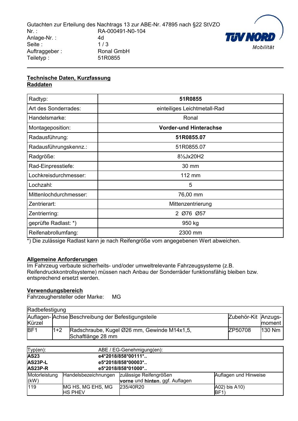Dieses Gutachten (abe) bezieht sich auf die Alufelge Ronal 51R0855 in der Ausführung ET 0, Mittenloch 0 mm (KBA 47895). Im PDF findest du typischerweise zulässige Reifengrößen, Auflagen/Anbauhinweise und – je nach Dokument – Hinweise zur Eintragung.
