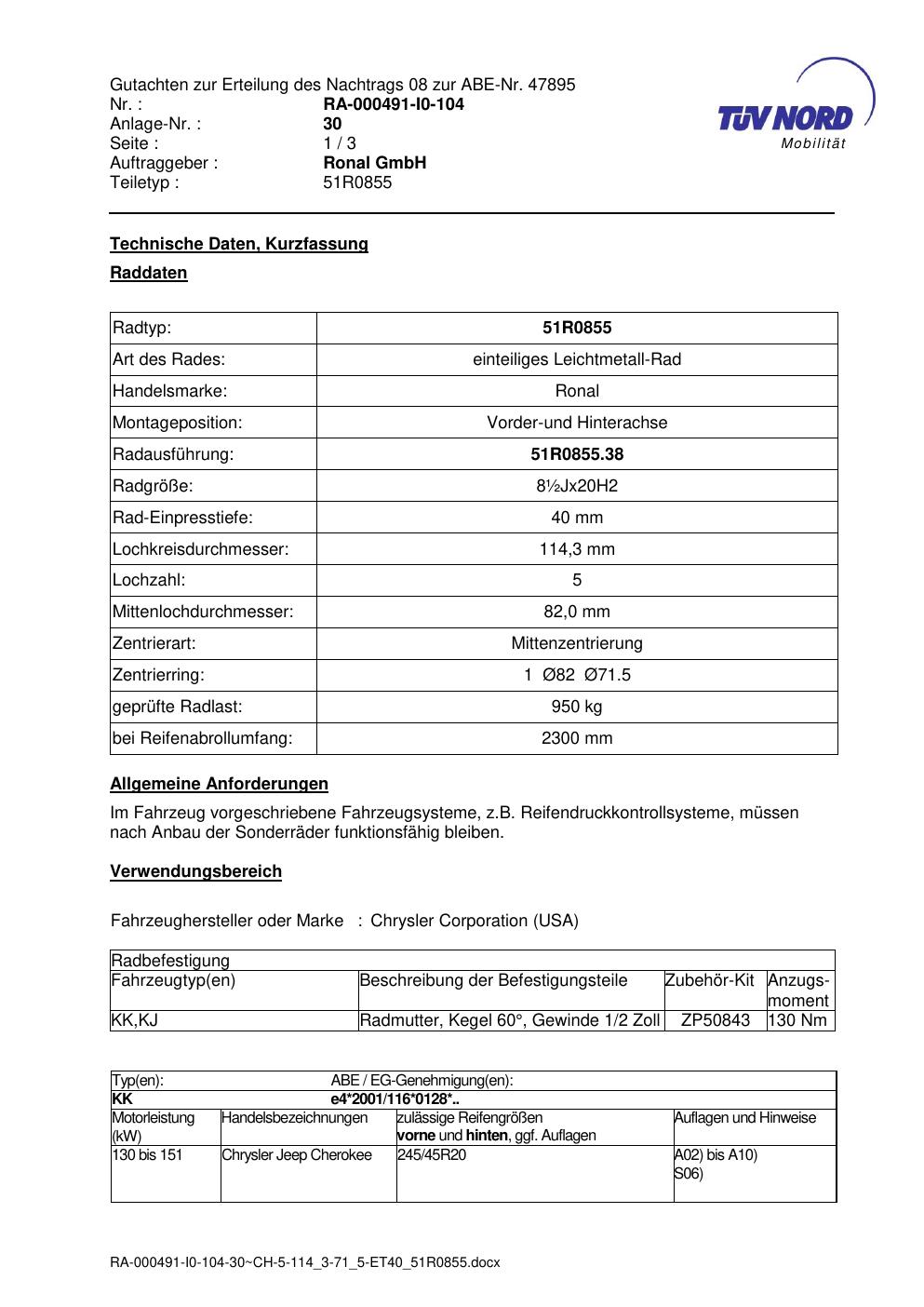 Dieses Gutachten (abe) bezieht sich auf die Alufelge Ronal 51R0855 in der Ausführung ET 0, Mittenloch 0 mm (KBA 47895). Im PDF findest du typischerweise zulässige Reifengrößen, Auflagen/Anbauhinweise und – je nach Dokument – Hinweise zur Eintragung.
