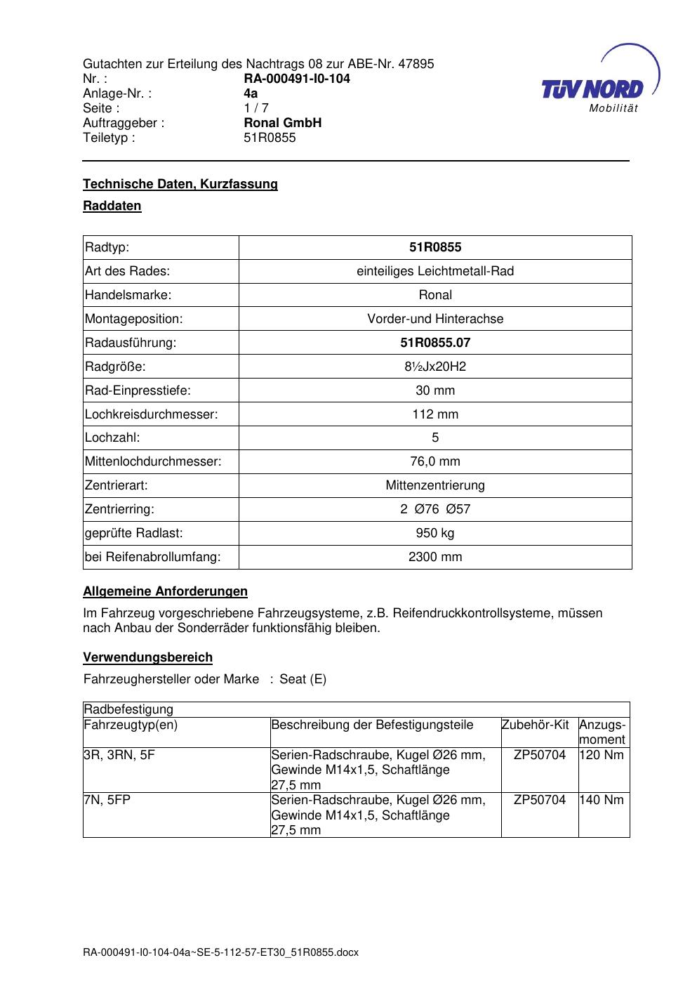 Dieses Gutachten (abe) bezieht sich auf die Alufelge Ronal 51R0855 in der Ausführung ET 0, Mittenloch 0 mm (KBA 47895). Im PDF findest du typischerweise zulässige Reifengrößen, Auflagen/Anbauhinweise und – je nach Dokument – Hinweise zur Eintragung.