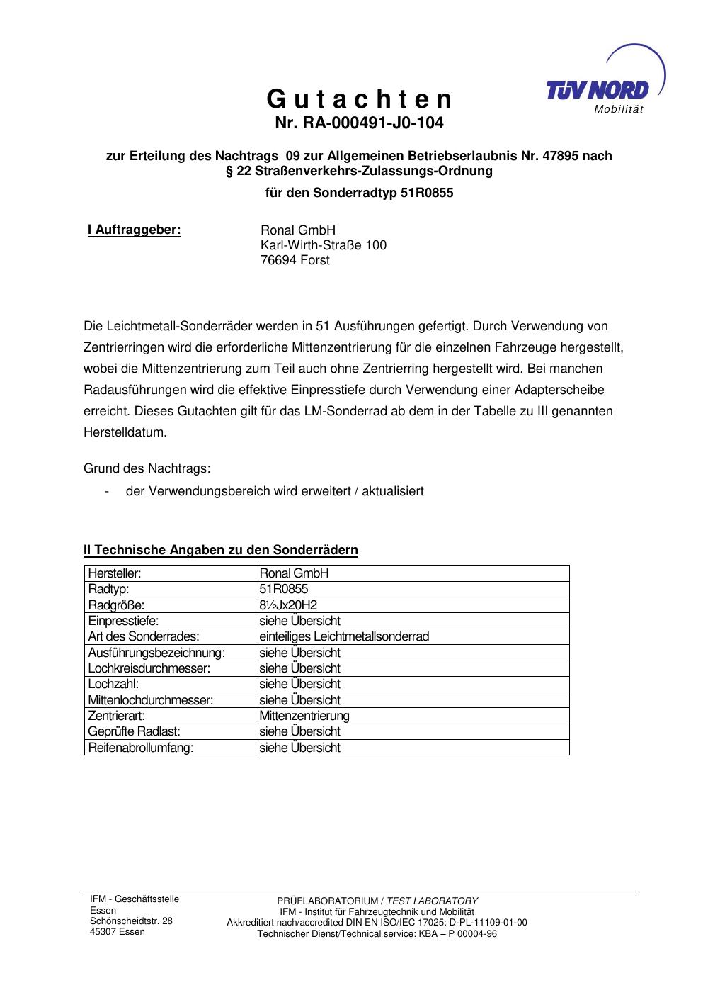 Dieses Gutachten (abe) bezieht sich auf die Alufelge Ronal 51R0855 in der Ausführung 8.5Jx2 ET 0, Mittenloch 0 mm (KBA 47895). Im PDF findest du typischerweise zulässige Reifengrößen, Auflagen/Anbauhinweise und – je nach Dokument – Hinweise zur Eintragung.