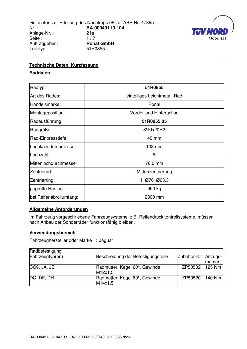 Dieses Gutachten (abe) bezieht sich auf die Alufelge Ronal 51R0855 in der Ausführung ET 0, Mittenloch 0 mm (KBA 47895). Im PDF findest du typischerweise zulässige Reifengrößen, Auflagen/Anbauhinweise und – je nach Dokument – Hinweise zur Eintragung.