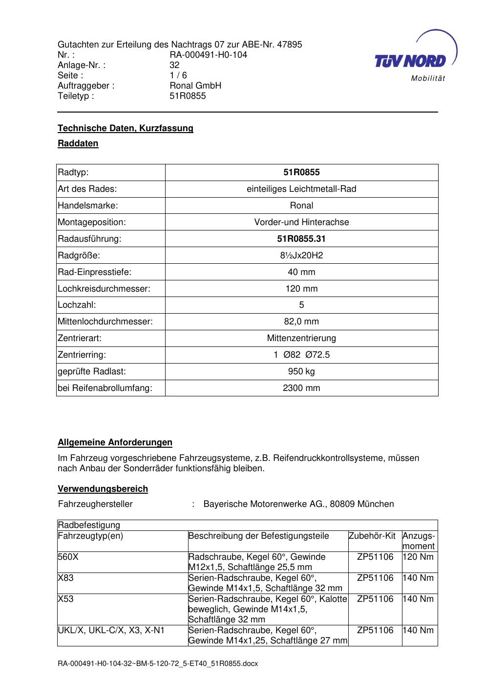 Dieses Gutachten (abe) bezieht sich auf die Alufelge Ronal 51R0855 in der Ausführung ET 0, Mittenloch 0 mm (KBA 47895). Im PDF findest du typischerweise zulässige Reifengrößen, Auflagen/Anbauhinweise und – je nach Dokument – Hinweise zur Eintragung.