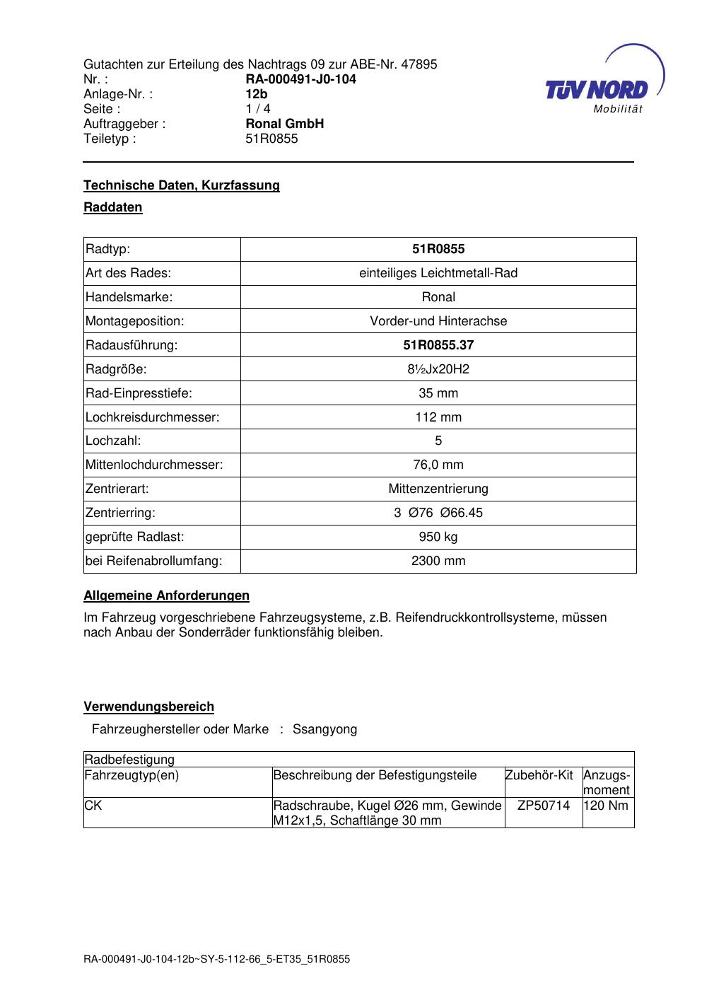 Dieses Gutachten (abe) bezieht sich auf die Alufelge Ronal 51R0855 in der Ausführung ET 0, Mittenloch 0 mm (KBA 47895). Im PDF findest du typischerweise zulässige Reifengrößen, Auflagen/Anbauhinweise und – je nach Dokument – Hinweise zur Eintragung.
