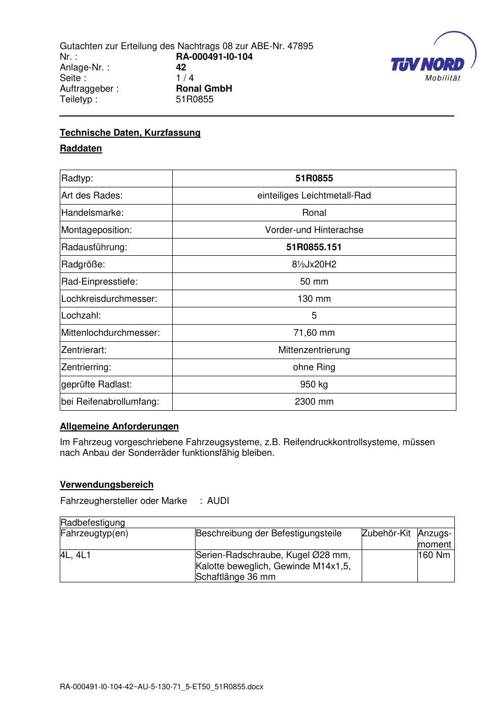 Dieses Gutachten (abe) bezieht sich auf die Alufelge Ronal 51R0855 in der Ausführung ET 0, Mittenloch 0 mm (KBA 47895). Im PDF findest du typischerweise zulässige Reifengrößen, Auflagen/Anbauhinweise und – je nach Dokument – Hinweise zur Eintragung.