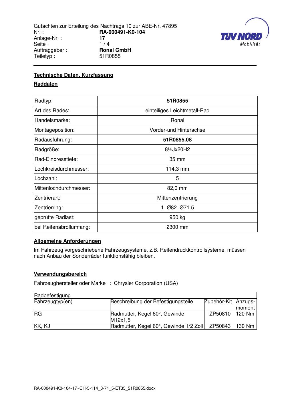 Dieses Gutachten (abe) bezieht sich auf die Alufelge Ronal 51R0855 in der Ausführung ET 0, Mittenloch 0 mm (KBA 47895). Im PDF findest du typischerweise zulässige Reifengrößen, Auflagen/Anbauhinweise und – je nach Dokument – Hinweise zur Eintragung.
