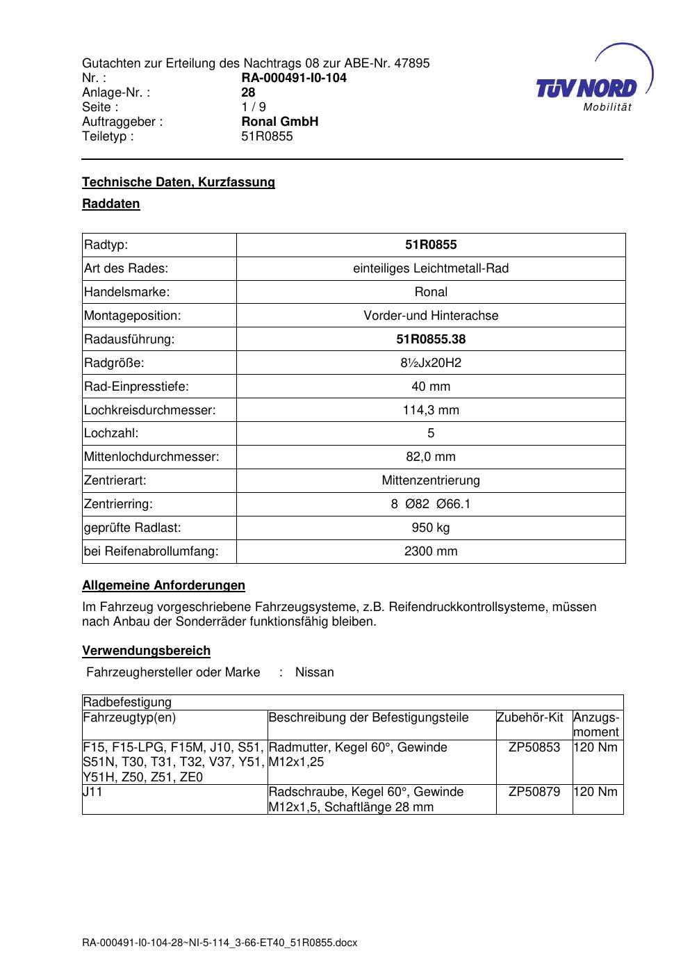 Dieses Gutachten (abe) bezieht sich auf die Alufelge Ronal 51R0855 in der Ausführung ET 0, Mittenloch 0 mm (KBA 47895). Im PDF findest du typischerweise zulässige Reifengrößen, Auflagen/Anbauhinweise und – je nach Dokument – Hinweise zur Eintragung.