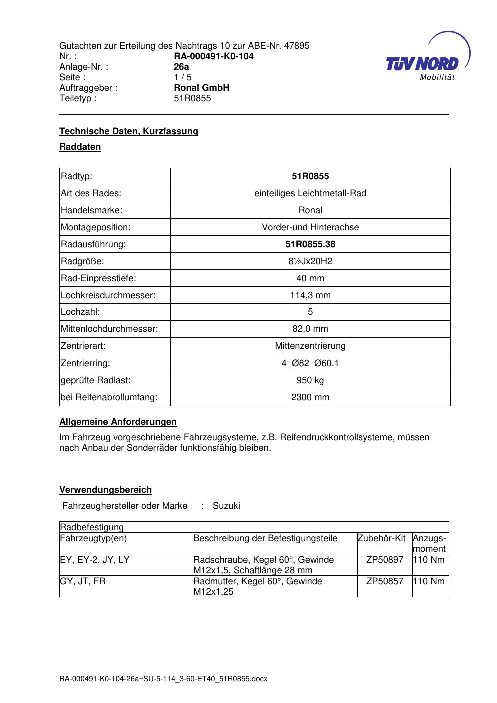 Dieses Gutachten (abe) bezieht sich auf die Alufelge Ronal 51R0855 in der Ausführung ET 0, Mittenloch 0 mm (KBA 47895). Im PDF findest du typischerweise zulässige Reifengrößen, Auflagen/Anbauhinweise und – je nach Dokument – Hinweise zur Eintragung.
