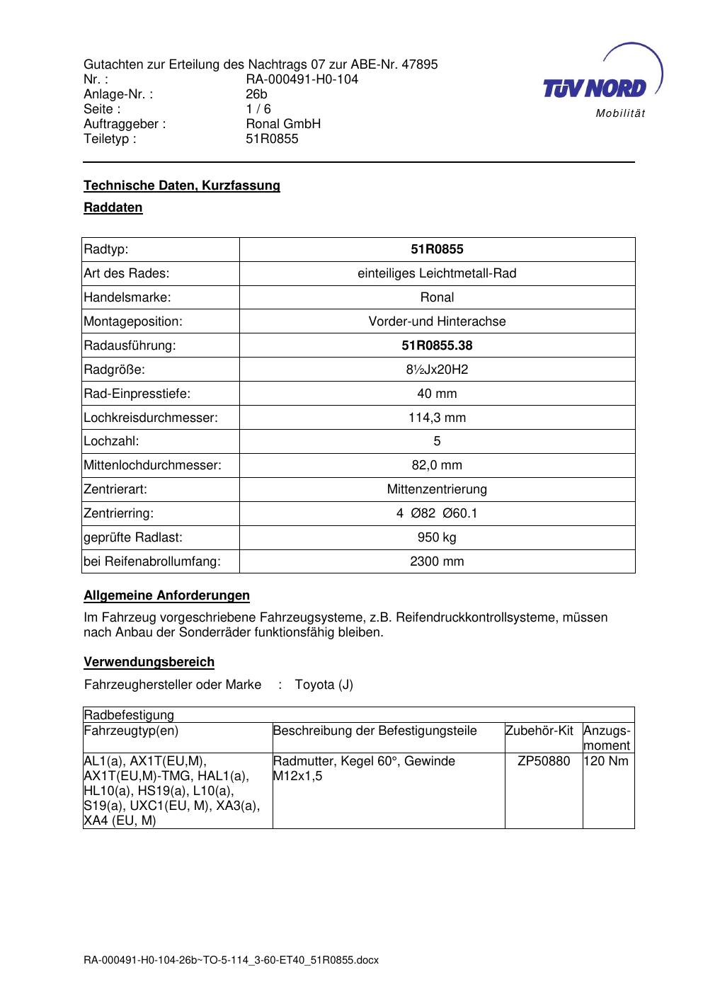 Dieses Gutachten (abe) bezieht sich auf die Alufelge Ronal 51R0855 in der Ausführung ET 0, Mittenloch 0 mm (KBA 47895). Im PDF findest du typischerweise zulässige Reifengrößen, Auflagen/Anbauhinweise und – je nach Dokument – Hinweise zur Eintragung.