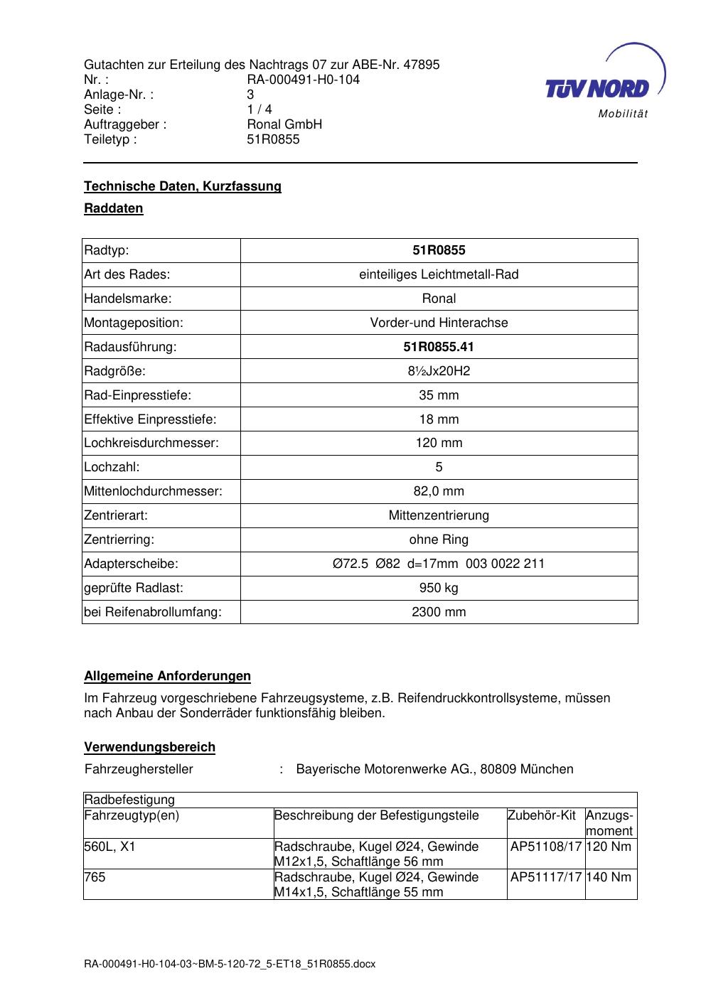 Dieses Gutachten (abe) bezieht sich auf die Alufelge Ronal 51R0855 in der Ausführung ET 0, Mittenloch 0 mm (KBA 47895). Im PDF findest du typischerweise zulässige Reifengrößen, Auflagen/Anbauhinweise und – je nach Dokument – Hinweise zur Eintragung.