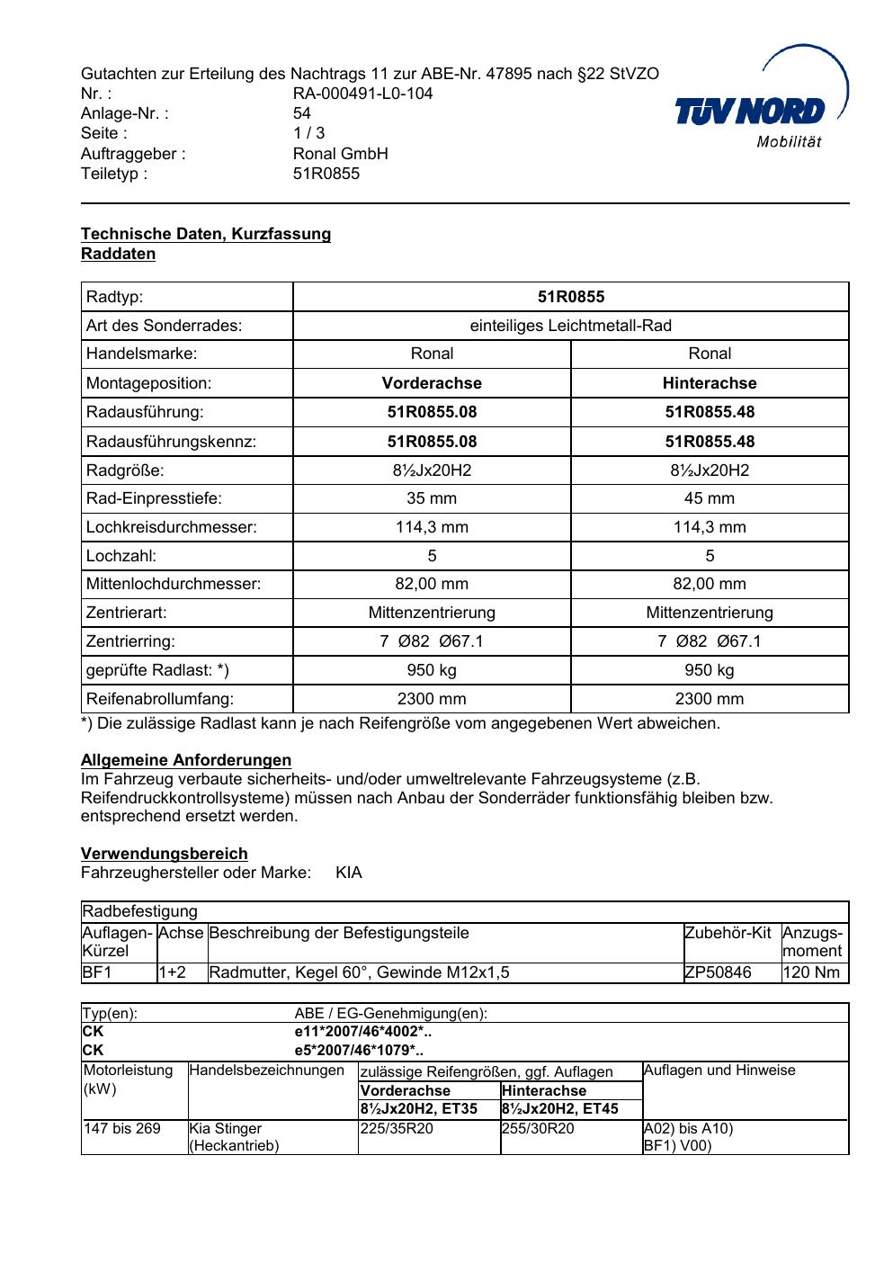 Dieses Gutachten (abe) bezieht sich auf die Alufelge Ronal 51R0855 in der Ausführung ET 0, Mittenloch 0 mm (KBA 47895). Im PDF findest du typischerweise zulässige Reifengrößen, Auflagen/Anbauhinweise und – je nach Dokument – Hinweise zur Eintragung.
