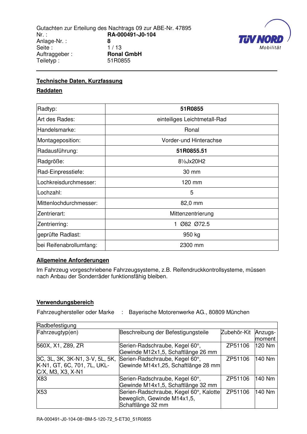 Dieses Gutachten (abe) bezieht sich auf die Alufelge Ronal 51R0855 in der Ausführung ET 0, Mittenloch 0 mm (KBA 47895). Im PDF findest du typischerweise zulässige Reifengrößen, Auflagen/Anbauhinweise und – je nach Dokument – Hinweise zur Eintragung.