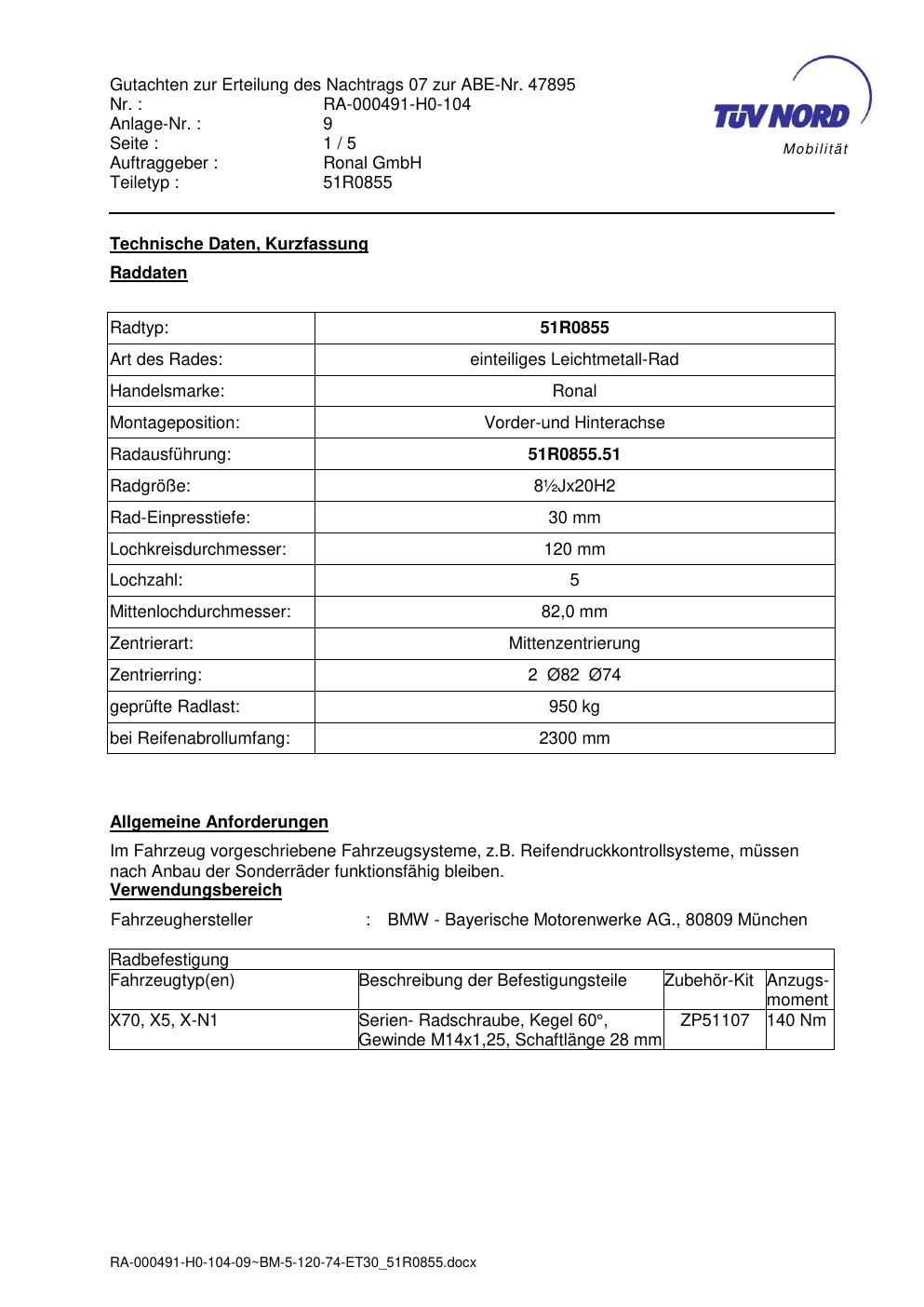 Dieses Gutachten (abe) bezieht sich auf die Alufelge Ronal 51R0855 in der Ausführung ET 0, Mittenloch 0 mm (KBA 47895). Im PDF findest du typischerweise zulässige Reifengrößen, Auflagen/Anbauhinweise und – je nach Dokument – Hinweise zur Eintragung.