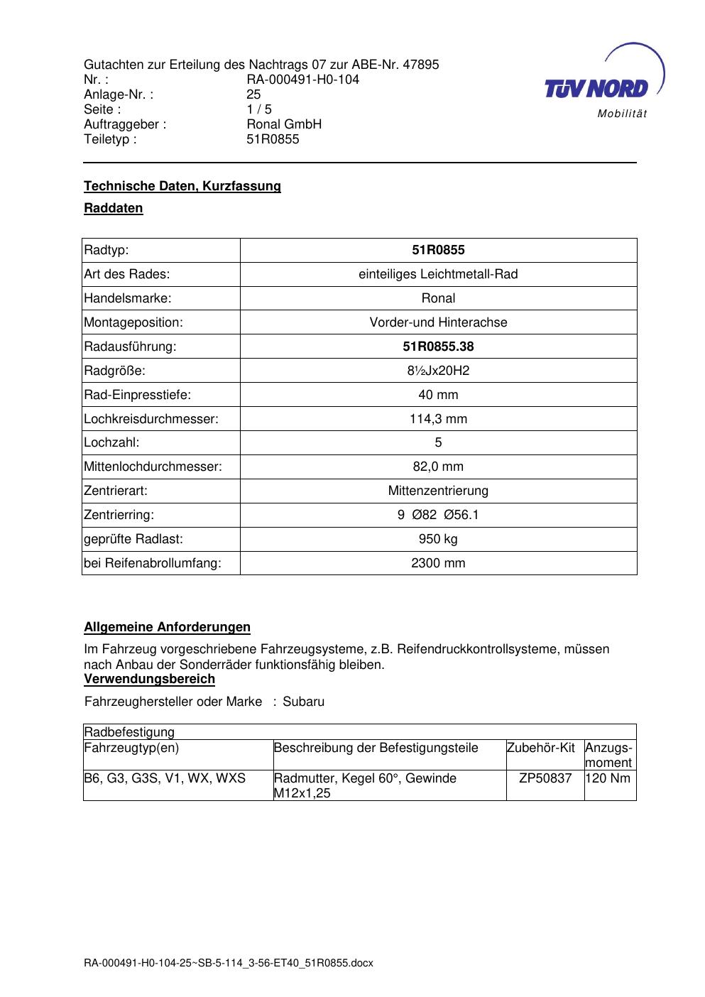 Dieses Gutachten (abe) bezieht sich auf die Alufelge Ronal 51R0855 in der Ausführung ET 0, Mittenloch 0 mm (KBA 47895). Im PDF findest du typischerweise zulässige Reifengrößen, Auflagen/Anbauhinweise und – je nach Dokument – Hinweise zur Eintragung.
