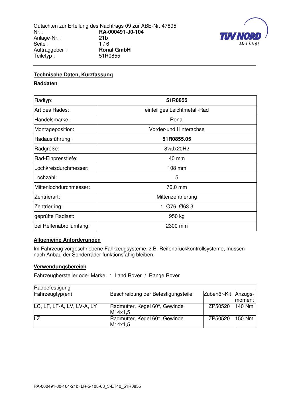 Dieses Gutachten (abe) bezieht sich auf die Alufelge Ronal 51R0855 in der Ausführung ET 0, Mittenloch 0 mm (KBA 47895). Im PDF findest du typischerweise zulässige Reifengrößen, Auflagen/Anbauhinweise und – je nach Dokument – Hinweise zur Eintragung.