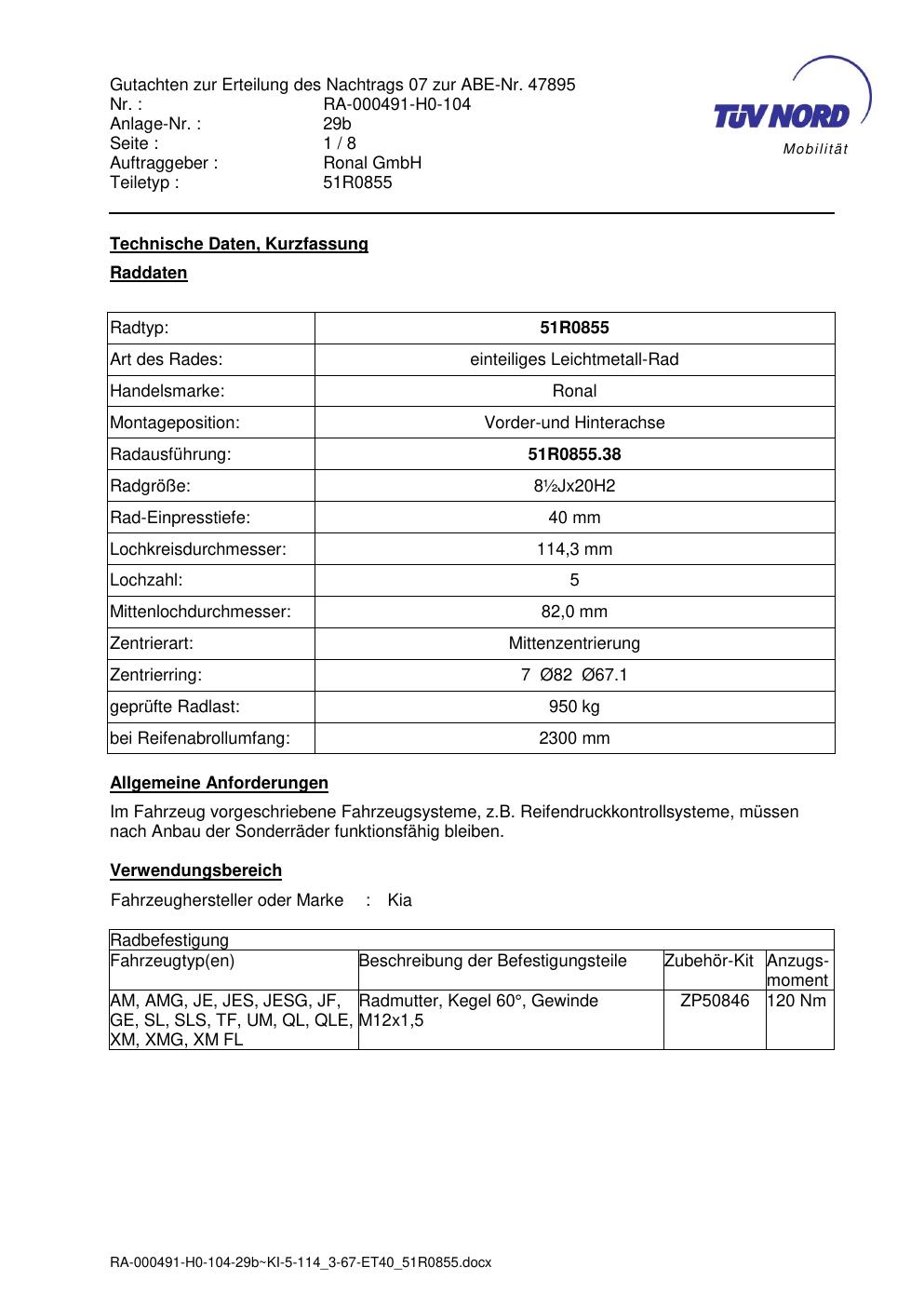 Dieses Gutachten (abe) bezieht sich auf die Alufelge Ronal 51R0855 in der Ausführung ET 0, Mittenloch 0 mm (KBA 47895). Im PDF findest du typischerweise zulässige Reifengrößen, Auflagen/Anbauhinweise und – je nach Dokument – Hinweise zur Eintragung.